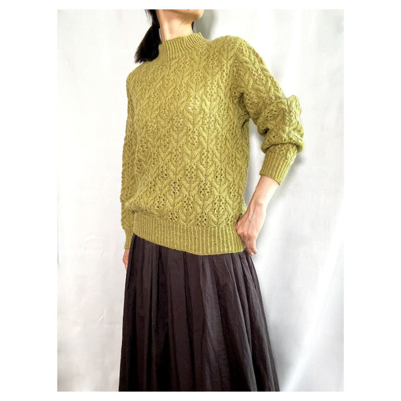 ゲンノショウコで染めた糸で手編みした、優しい黄緑色の一点もののセーターです。