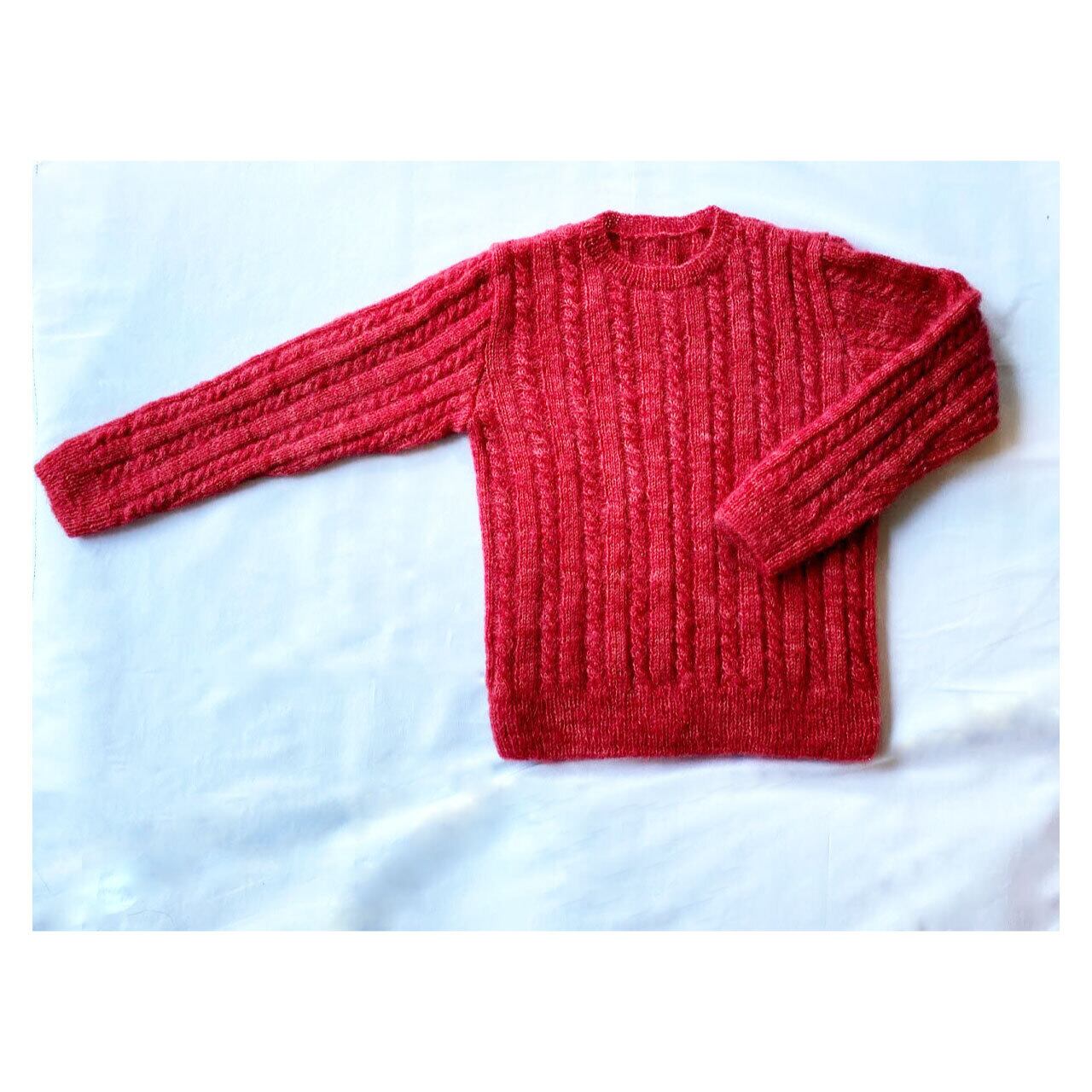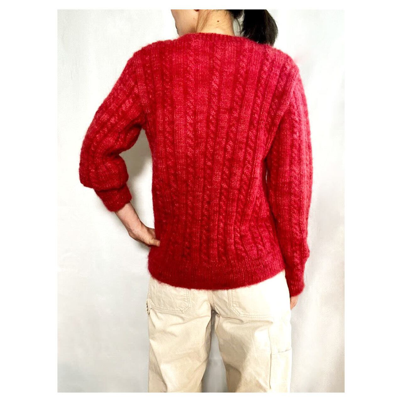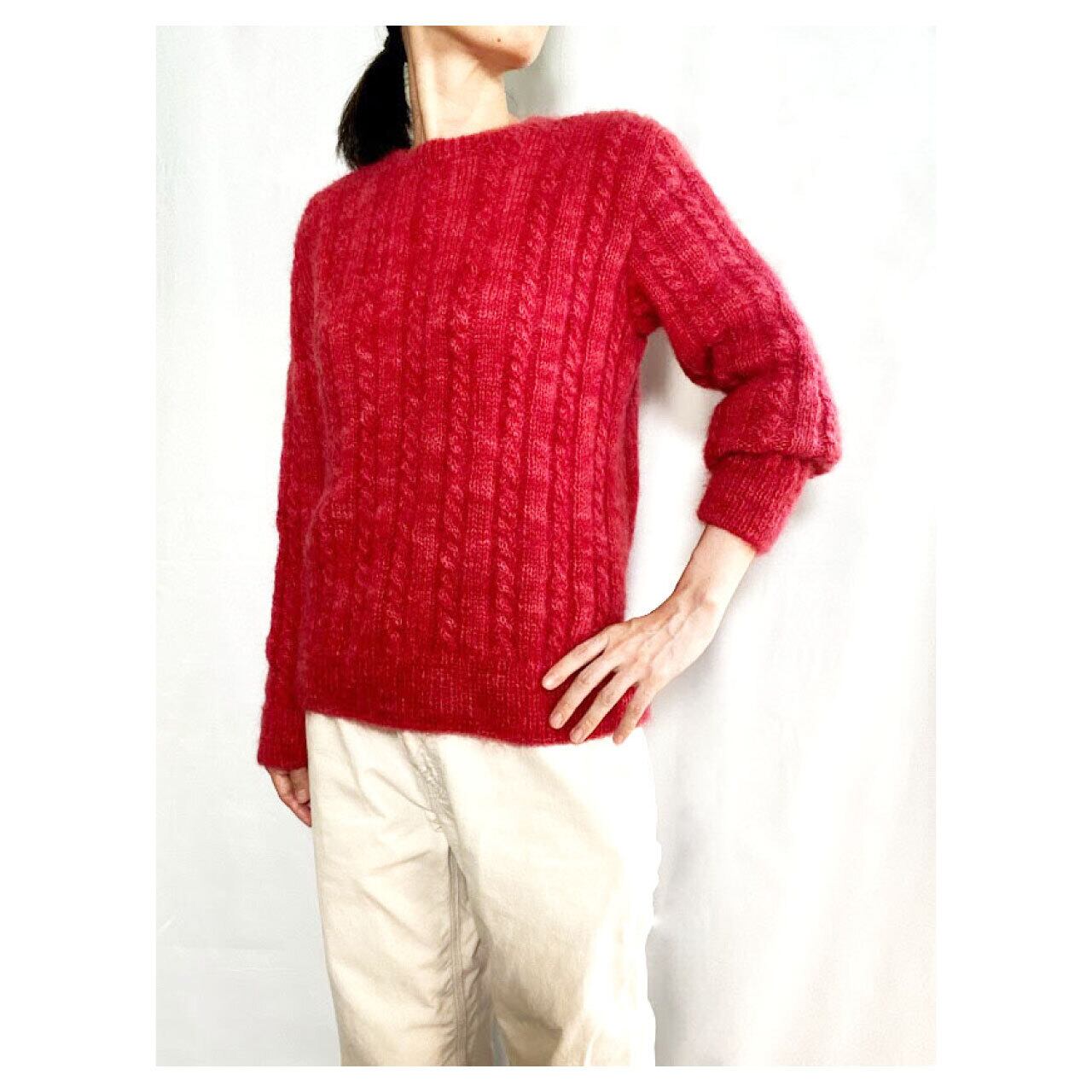 茜で染めたモヘアで手編みした、華やかで上品な一点もののセーターです。