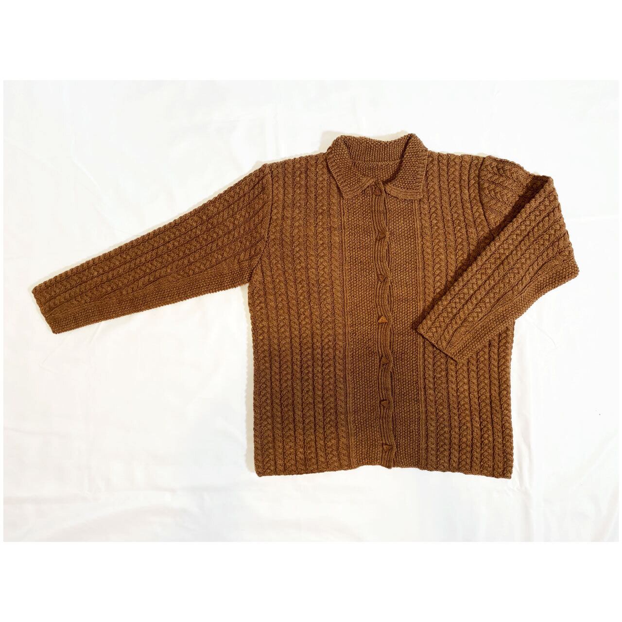ヤシャブシで染めた毛糸で編んだ薄手の襟付きカーディガン