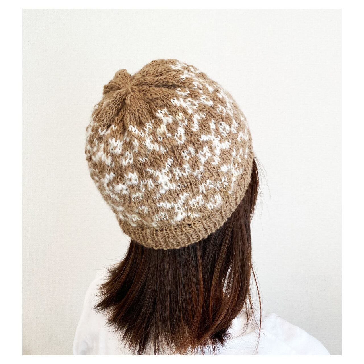 栗で染めた原毛を手紡ぎした毛糸で編んだ編み込み模様の帽子