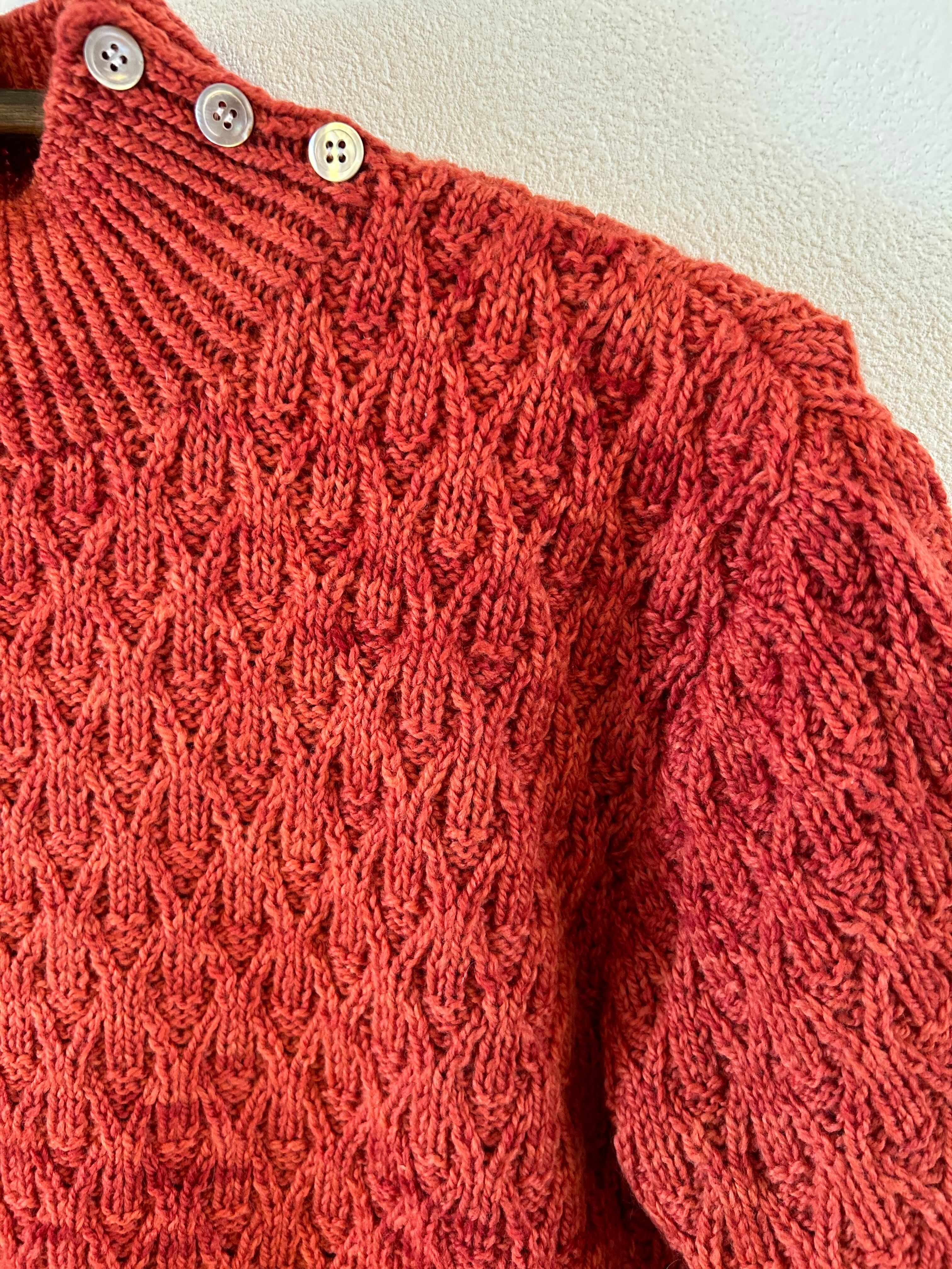 鮮やかなあかね色に、貝ボタンがアクセントとなっています。