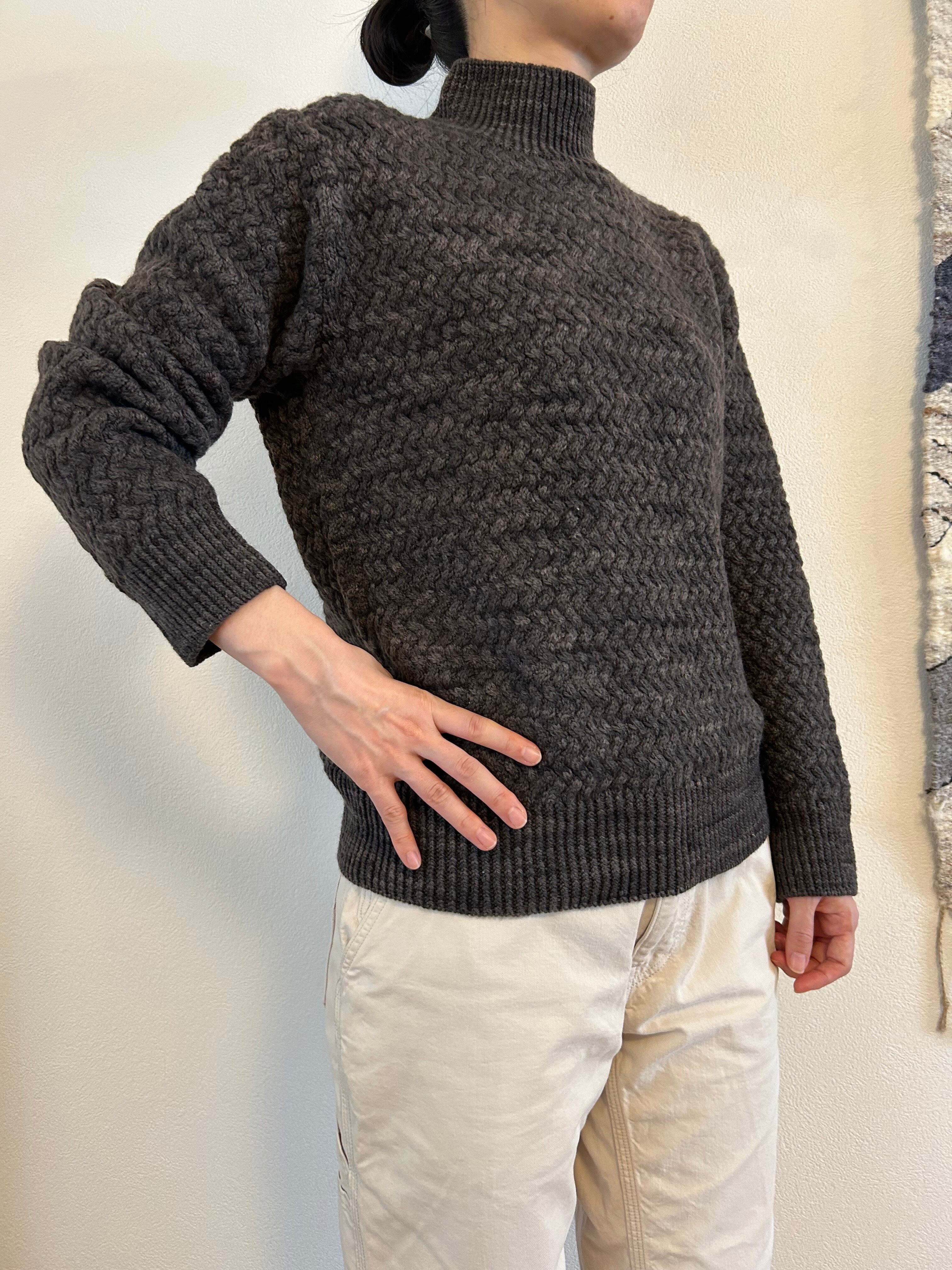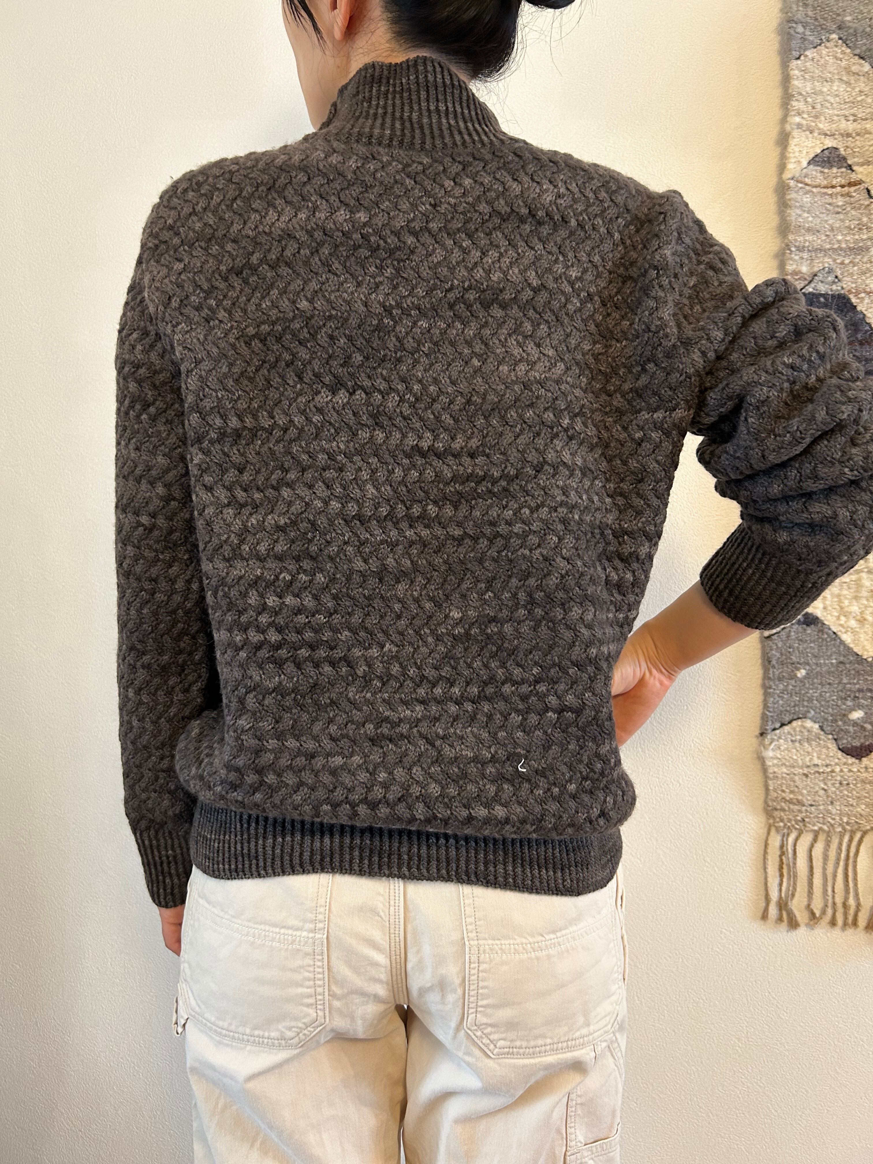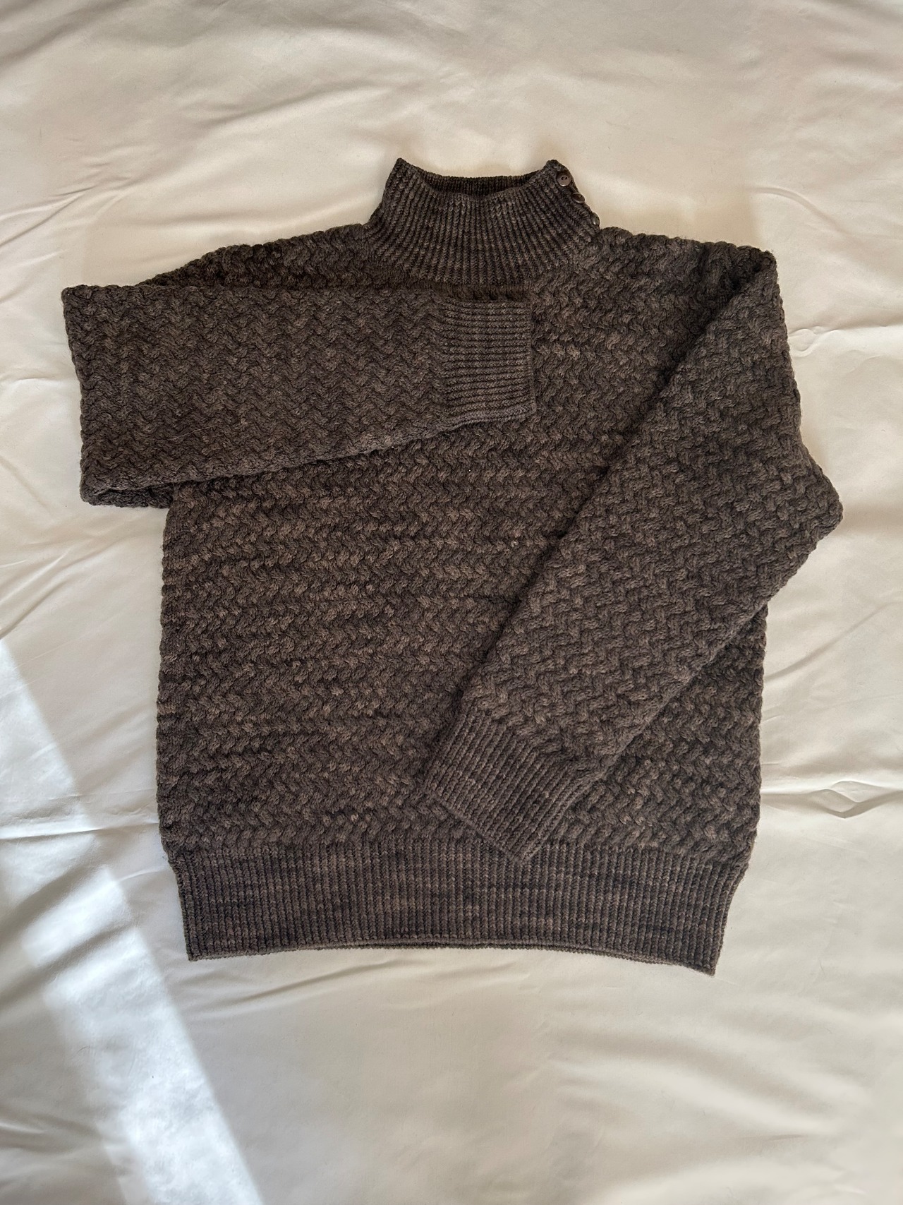 ザクロで染めた糸で編んだ、襟開きボタンのセーターです。